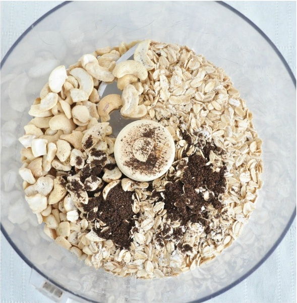Necesitamos un procesador de alimentos. En ella se ponen los anacardos crudos, con avena, sal marina y vainilla triturada. Mezclar a velocidad máxima durante 1 minuto.